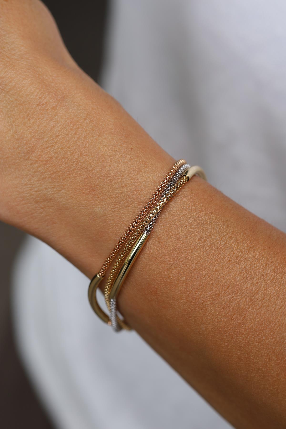 Yenigün Kuyumculuk14 Ayar Altın Yassı Plaka Detaylı Üç Renk Kalze Bileklik