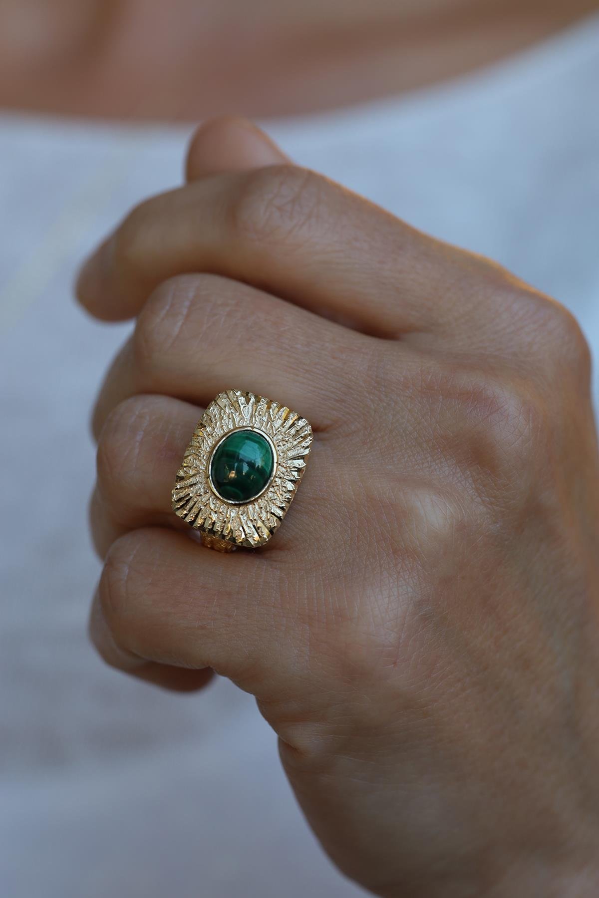 Yenigün Kuyumculuk14 Ayar Altın Yeşil Taş Detaylı Antik Tasarım Yüzük